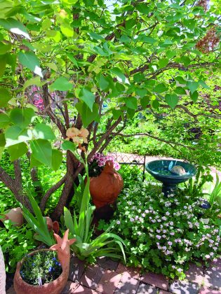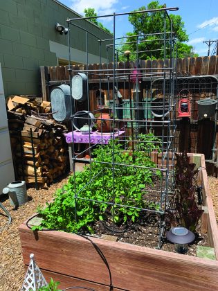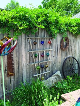 A saw blade, a fan trellis, a grapevine wreath and a wagon wheel adorn the fence. A dear friend gave Sylvia and Wayne a wood-carved replica of “El Santuario de Chimayó,” located in Chimayó, New Mexico. It sits at the base of the trellis.