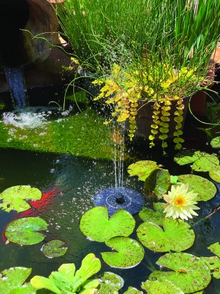 (Photo above): Goldfish frolic under the pond’s solar-powered fountain. The clay pot, called an olla, pumps water into the pond to keep the pond fresh and give the goldfish “back massages.”