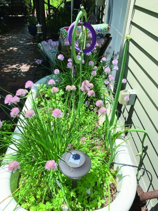 Sylvia’s a big fan of unconventional planters, so she filled a cast-iron bathtub with Mexican and green oregano, spring onion, garlic and chives, and added a decorative spinner for a whimsical touch and a solar light so it can be enjoyed at night.