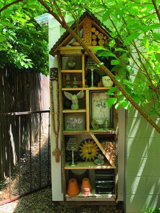 Strolling through Denver Botanic Gardens a few years ago, Sylvia spotted a shadowbox like this one and hurried home to ask her “resident handyman” (husband Wayne) to make one just like it. “I had him attach it to the side of the tool shed, to dress that up a bit,” Sylvia says, “and I never run out of ‘kitsch’ to fill it with.”