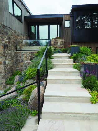 Drainage—always a problem on steep lots—was another challenge. “We had to get water to flow out and around the house without going into the neighbors’ property,” Hartman says. His crew accomplished this by building a large drainage system into a flagstone patio on one of the terraces that directs water from the home’s gutters into a dry stream bed that empties at the bottom of the front yard.