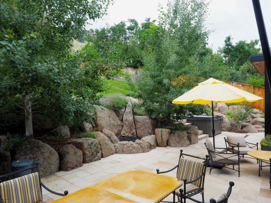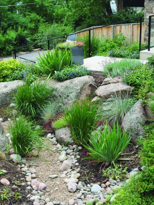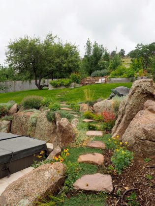 Luckett asked Hartman to complete and execute a rough design drawn up by Boulder-based Marpa Landscape Architecture. “The big thing was just how to retain everything and create a garden at the same time,” Hartman says. “We did that with boulders—placing and figuring out how to make all these boulders work together in a natural setting.”