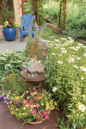 “This antique metal mesh chair was being thrown out, so I grabbed it, knowing I could always find a place for it in my garden,” Edie says. “The rock sitting on the chair says ‘Garden of Weedin’—very appropriate for any garden! It fondly reminds me of the name of my former commercial plant leasing and maintenance company: ‘Garden of Edie.’” (Photo by