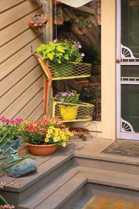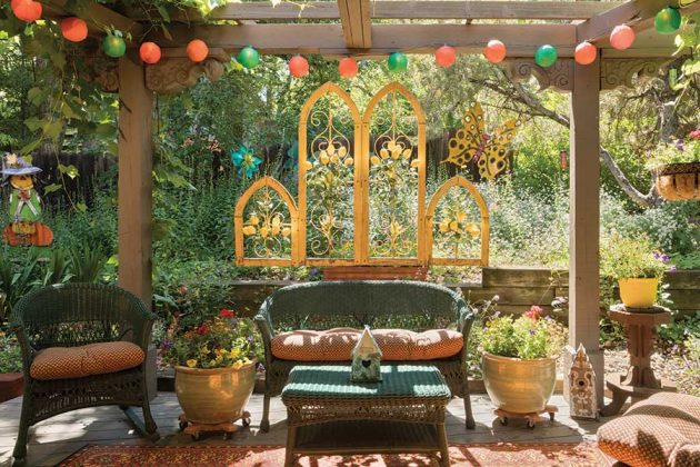 The back deck has a loveseat, rocking chair and chaise lounge, where Edie loves to relax and read. Hanging and potted plants make it cozy, and two antique birdhouses give it a hint of whimsy. An old wood-and-metal art piece that Edie painted yellow to match the garden flowers hangs behind the sofa. “It’s like you’re looking out a window to the backyard, so it really makes it feel like an outdoor room,” she says. Festive colored lights and a brightly colored rug brighten the deck at twilight. The rug, from madmats.com, is made of UV-resistant recycled plastic. “I’ve had it 10 years, and it’s held up really well in the elements and never faded.” When it starts to fray on one side, you can flip it, she says, and it looks brand new with the colors reversed. (Photo by