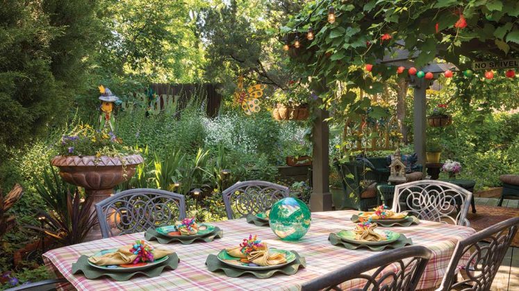 The Mandels love their outdoor patio and often host dinner parties for friends, neighbors and family. Edie enjoys crafting things, and made the cute napkin holders from ribbons. The table globe amplifies the garden’s colors, and the concrete fountain behind the table was turned into a flower bowl “after the raccoons found it too much fun to play in when it was a fountain,” Edie says. She started the pergola’s expansive grape ivy with two cuttings from a friend’s vine many years ago, but it’s never produced grapes and Japanese beetles have devoured it, so she’s considering replacing it with wisteria. (Photo by