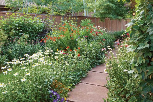 Pedestrians on the walkway by the fence alongside the Mandels’ home always look forward to the garden bursting into a kaleidoscope of color each spring and summer. “Neighbors and friends who are nature photographers often stop by just to take photos,” Theo says. The red crocosmia blooms are one of Edie’s favorite plants. “They add a pop of fiery red to the garden,” she says, “and that one’s name is ‘Lucifer’ crocosmia!” (Photo by