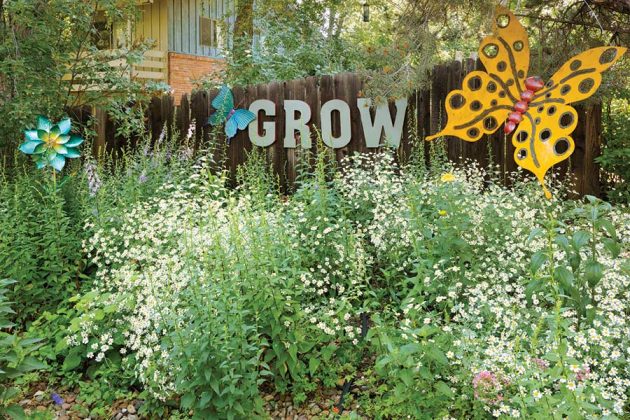 Edie loves yard art, which she makes and integrates into her garden from items she finds, buys or repurposes. She discovered the “GROW” metal letters and the smaller metal butterfly at a home-goods store and painted them to accent the wooden fence at the rear of the garden. She found the larger metal butterfly at a local garden center and hung it from the pine tree. “When all the flowers die back in winter, the butterflies cheer up the garden with their bright colors,” she says. (Photo by