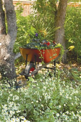 Theo found the wheelbarrow on Craigslist. He took it apart, cleaned it, removed the rust and drilled holes in the bottom for drainage. “I painted it bright orange and planted a variety of small plants in it,” Edie says. “For a fun touch, I tied bright garden gloves to the end of the two handles.” (Photo by