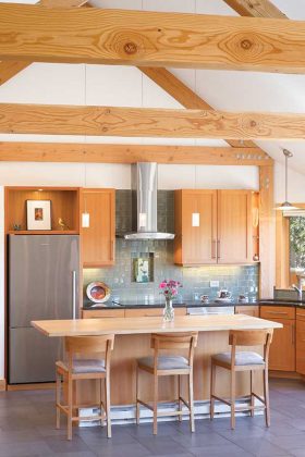 Above photo: The open layout and vaulted ceilings create a living room that feels spacious, despite its narrow dimensions. Bold wooden beams create natural frames, and their light tone contrasts with the fireplace surround and dark stone floor tiles. Benches along the wall have storage drawers beneath. Part of the concept of the Little Ship House is that everything stows, continuing the nautical theme, homeowner Andi OConor says.