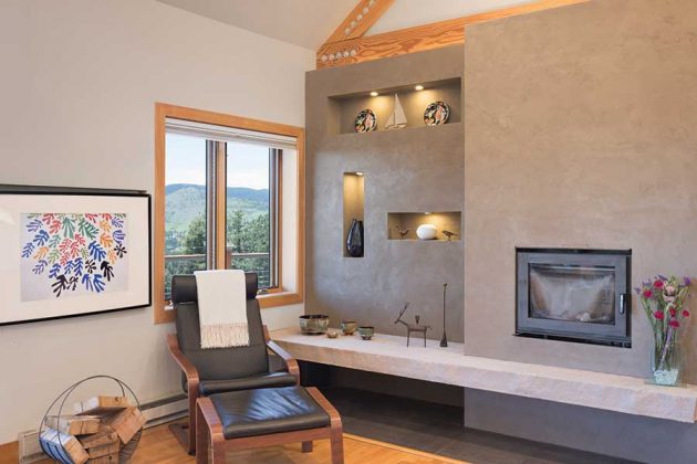 The stone slab below the fireplace is a single, massive sandstone piece with fossilized ocean sand ripples—a sentimental feature, as it’s the same type of stone O’Conor studied when she was a park ranger. The fireplace surround is American Clay, handmade by Kip Golden of Earth Clay Works in Boulder. The overall effect is modern with its sleek lines, yet earthy with its textured finish.(photo by WeinrauchPhotography.com)