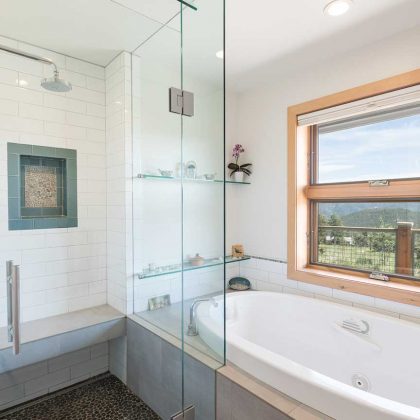 Natural elements come together in this bright bathroom. The shower floor is studded with dark pebbles and the shower niche is adorned with donated sea glass. More sea glass accents the bathtub above the white tile backsplash, while a window lets in refreshing mountain air(photo by WeinrauchPhotography.com)