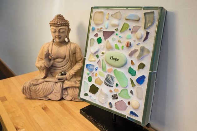 Members of the North American Sea Glass Association donated some of their most prized sea glass to O’Conor after hearing that her own collection was lost in the fire that claimed her home. She used some of those pieces for this plaque to remind her that hope is never lost, especially when the people around us have so much kindness in their hearts.(photo by WeinrauchPhotography.com)