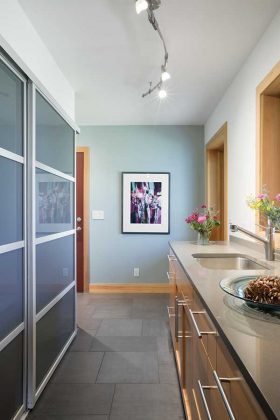Sliding panel doors hide the washer and dryer to the left. The laundry room’s doors and other closet doors are from The Sliding Door Company (slidingdoorco.com). O’Conor acquired the painting on the far wall at an art giveaway at Chautauqua, where local artists donated their work to people whose houses were destroyed by the Fourmile Canyon Fire. The painting, by Colorado artist Karen Scharer, is titled “Bouquet 2.”(photo by WeinrauchPhotography.com)