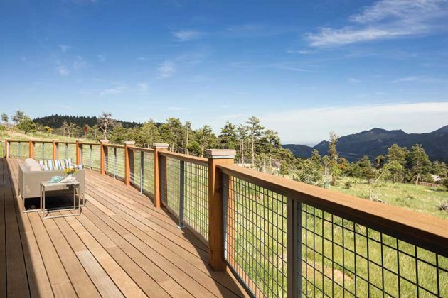 Architect David Barrett helped O’Conor refine her curved deck design. The curved railing has lights running along it to give the impression of a ship deck. “The lights are meant to mimic running lights on a ship at night,” O’Conor says. “They shine down, so as not to ruin stargazing.” High up in the mountains, heavy fog sometimes rolls in and O’Conor says she feels as if she’s sailing her Little Ship House through the clouds. “The deck has all the elements of the house,” O’Conor says, “so it’s all about synthesizing all those elements and the ‘Little Ship House’ theme into one place.” (photo by WeinrauchPhotography.com)