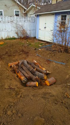 Using some hardwood at the bottom of your hügel bed with softer wood on top is considered ideal, but it’s fine to use whatever you have on hand. (Refer to “Killer Wood” below for possible exceptions). If it’s available, use deadwood that has already started to decompose a bit, as it will require less nitrogen to break down.