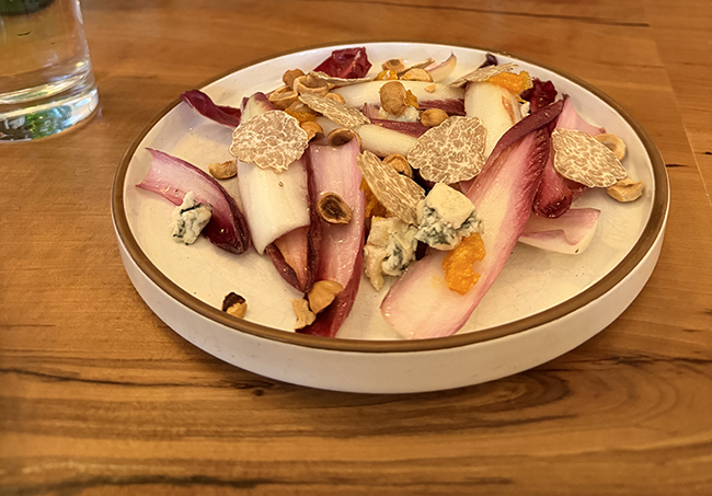 Both the endive and Marigold Caesar salads are the epitome of simple, yet sophisticated plates executed with expert skill. The endive is comprised of fresh, nutty, and mildly bitter endive leaves tinted a pale rose color. Their arresting color is only overshadowed by the pairing of Meyer lemon, soft, crumbly hazelnuts, and mild white shaved truffle. The combination is crisp, fun, and balanced. The Caesar is a near-daily menu staple—small, soft, crunchy lettuce heads are topped with a mild, creamy dressing, then piled with vibrant herbs, sprinkled with gin-washed trout roe for a delightful, surprising salty pop. Each bite lands somewhere between spring and early summer.